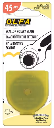 Circular dual purpose rotary replacement decorative Scallop/Peak designed to produce a scallop or peak pattern on the edge of the material being cut. Very popular with crafts and memory book development. Also great for use with Polar Fleece! This blade is made of stainless steel for sharpness and durability. For Deluxe 45mm Rotary Cutter (RTY2DX). 1 blade per pack. Good For: cutting fleece, fabric, photos, paper. Adds a wonderful decorative edge to any project.