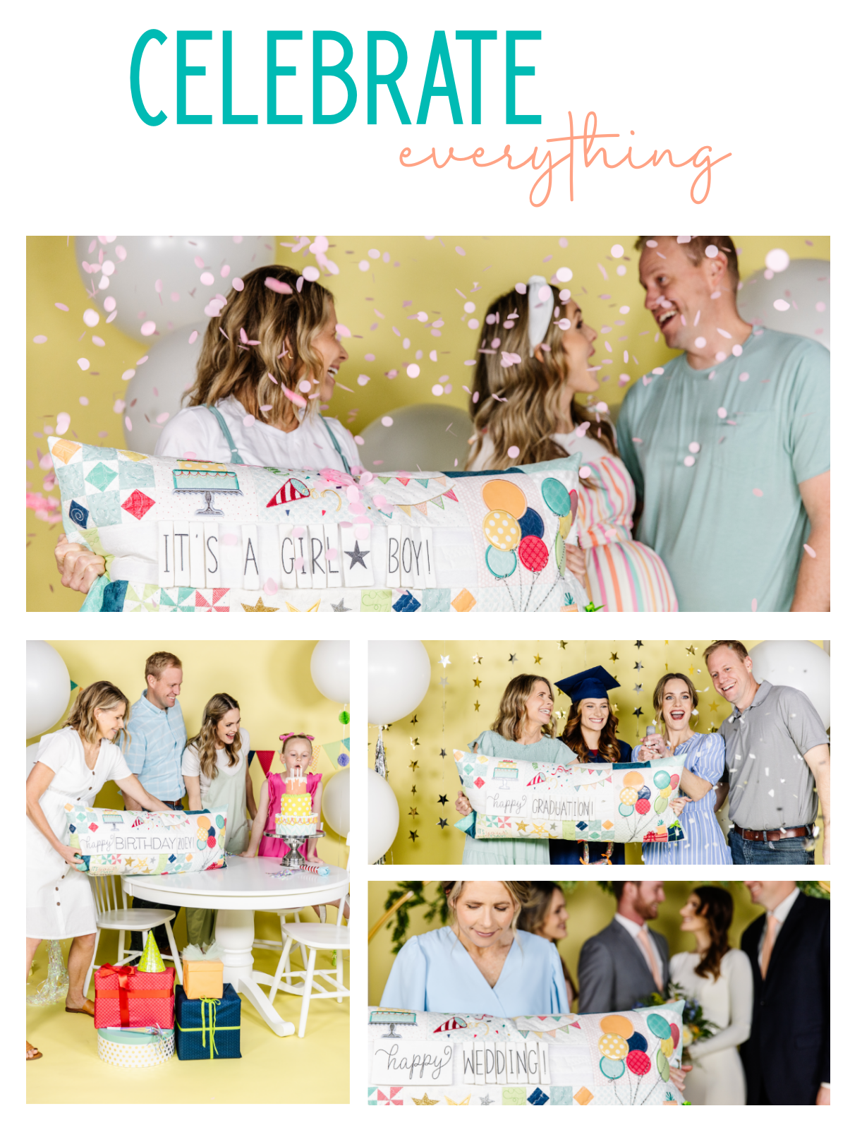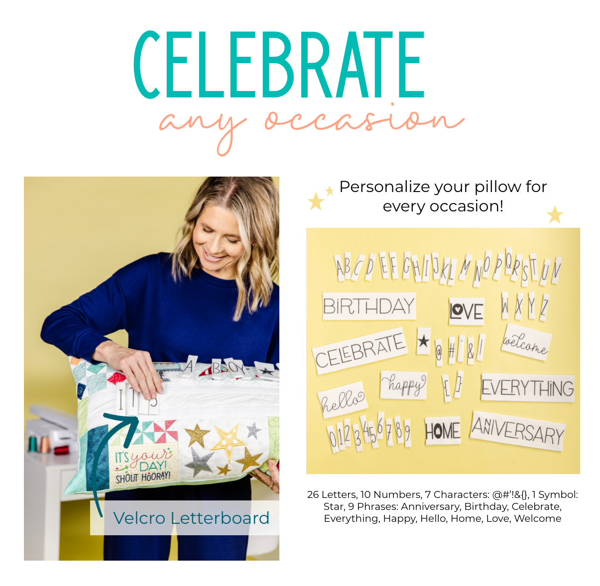 It’s your day! Shout hooray!” Kimberbell’s Shout Hooray Bench Pillow celebrates the people you love with confetti, cake, and so much more. Stitch names, dates, and greetings with our included alphabet and sentiments, then feature your message in our letterboard panel! Applique Glitter, Embroidery Leather, and iridescent Mylar add sparkle and shine to the stars, cake, and banner, while bright balloons float from strings of Kimberbell Twine. Add Flexi Foam and Iron-on Vinyl to make balloons “pop!” Pretty pinwheels and nine-patch blocks are easily pieced in-the-hoop, and applique gifts are topped with beautiful bows. With optional background quilting and delightful designs, your Shout Hooray Bench Pillow is perfect for every special occasion!